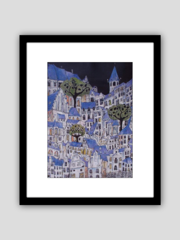 Print dimensions are 11" by 14". Matting is cut to 16" by 20". Image of print in mat and frame is not to scale. Frame not included.