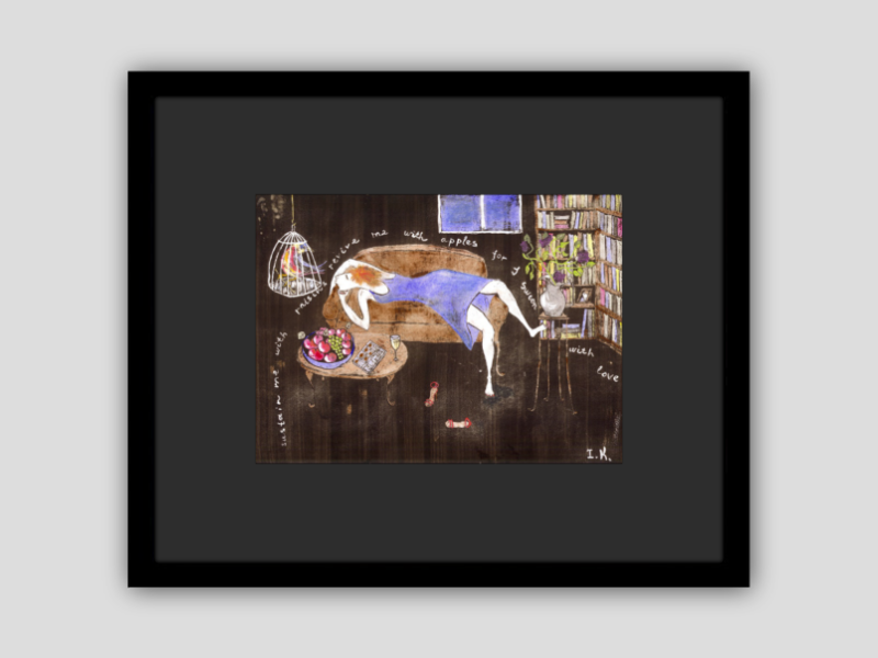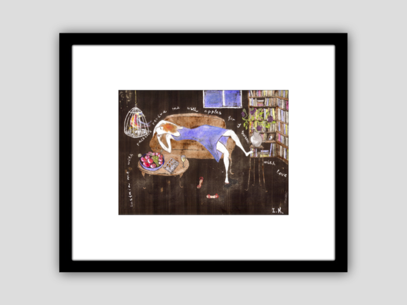 Print dimensions are 11" by 14". Matting is cut to 16" by 20". Image of print in mat and frame is not to scale. Frame not included.